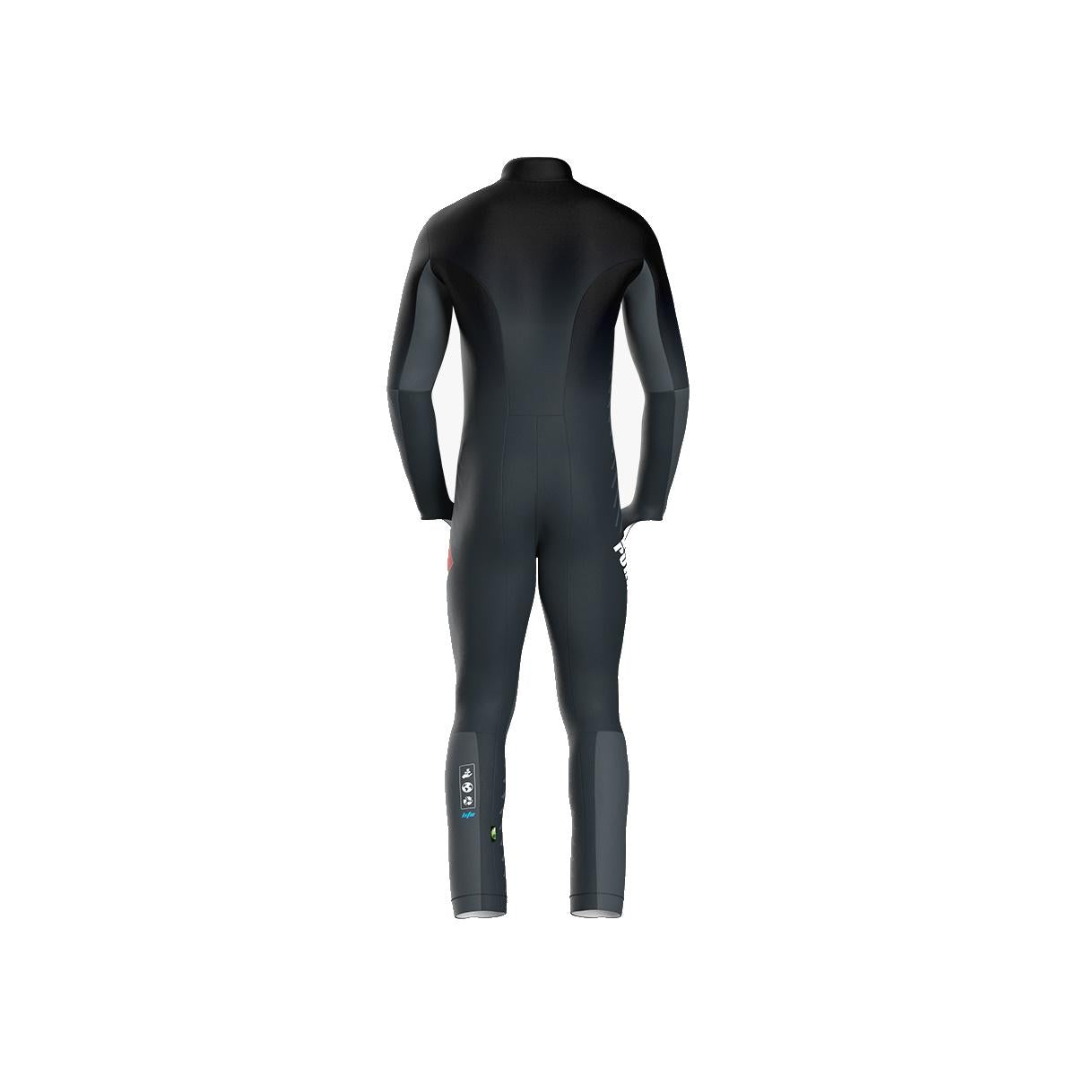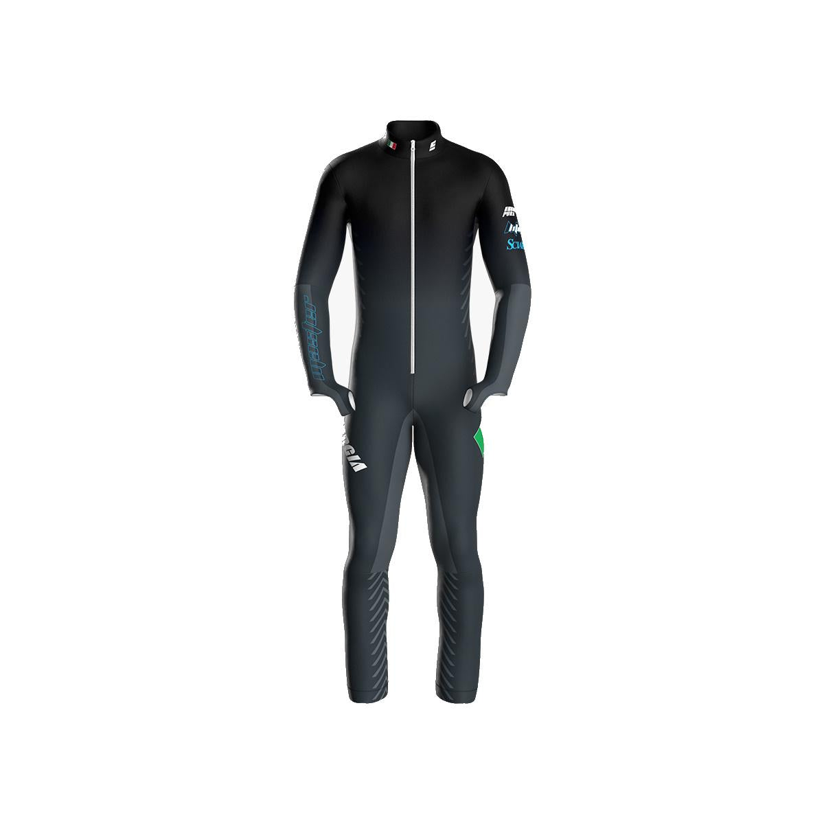 Race suit made of bi-elastic, breathable, windproof, and anti-pilling fabric. The suit's design was developed with the athlete's race positions in mind, ensuring an excellent fit, high elasticity to allow maximum freedom of movement in all positions. A zipper is inserted on the front to facilitate entry into the suit. An anti-slip silicone elastic is applied inside the leg cuff, allowing the suit to adhere better to the boot. The suit includes a skipass pocket. JUNIOR SIZES: 8-14; SENIOR: XS-XXL. SPEED: smooth fabric, not brushed on the inside